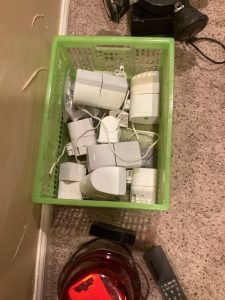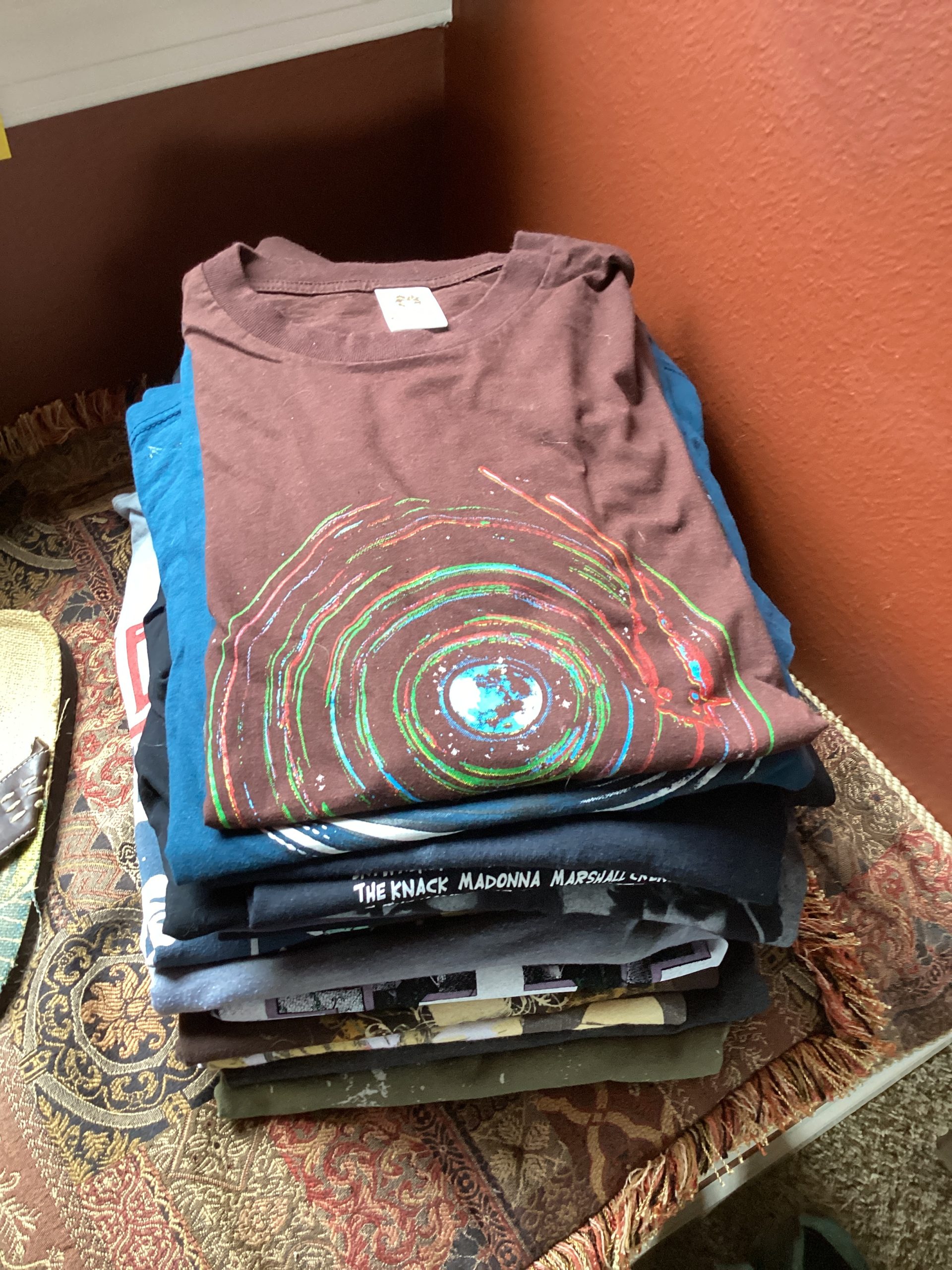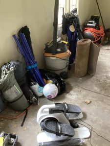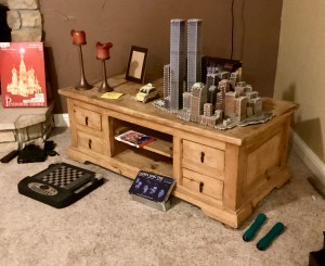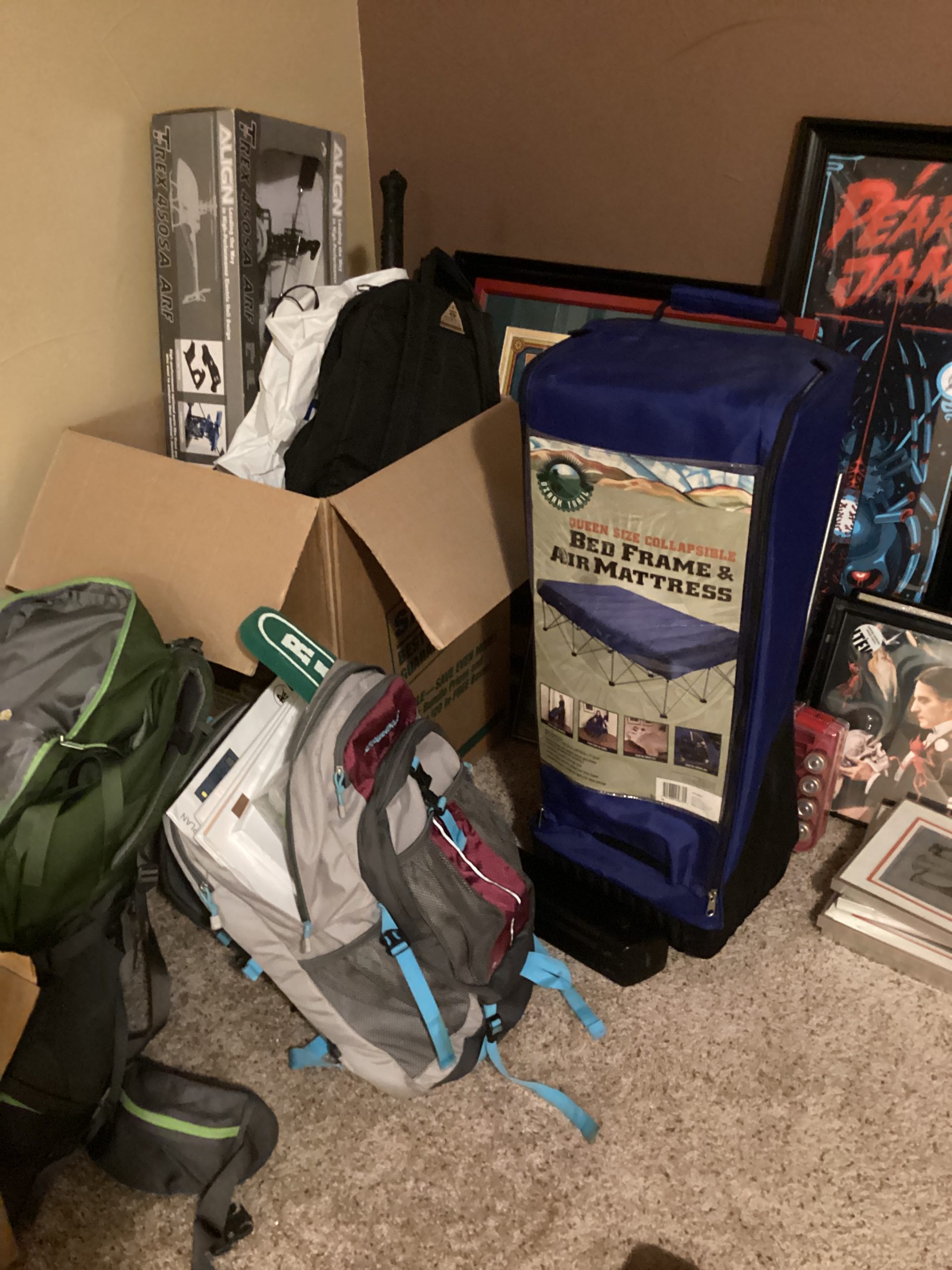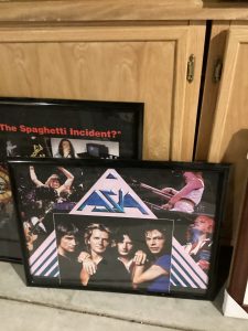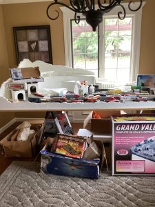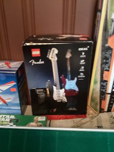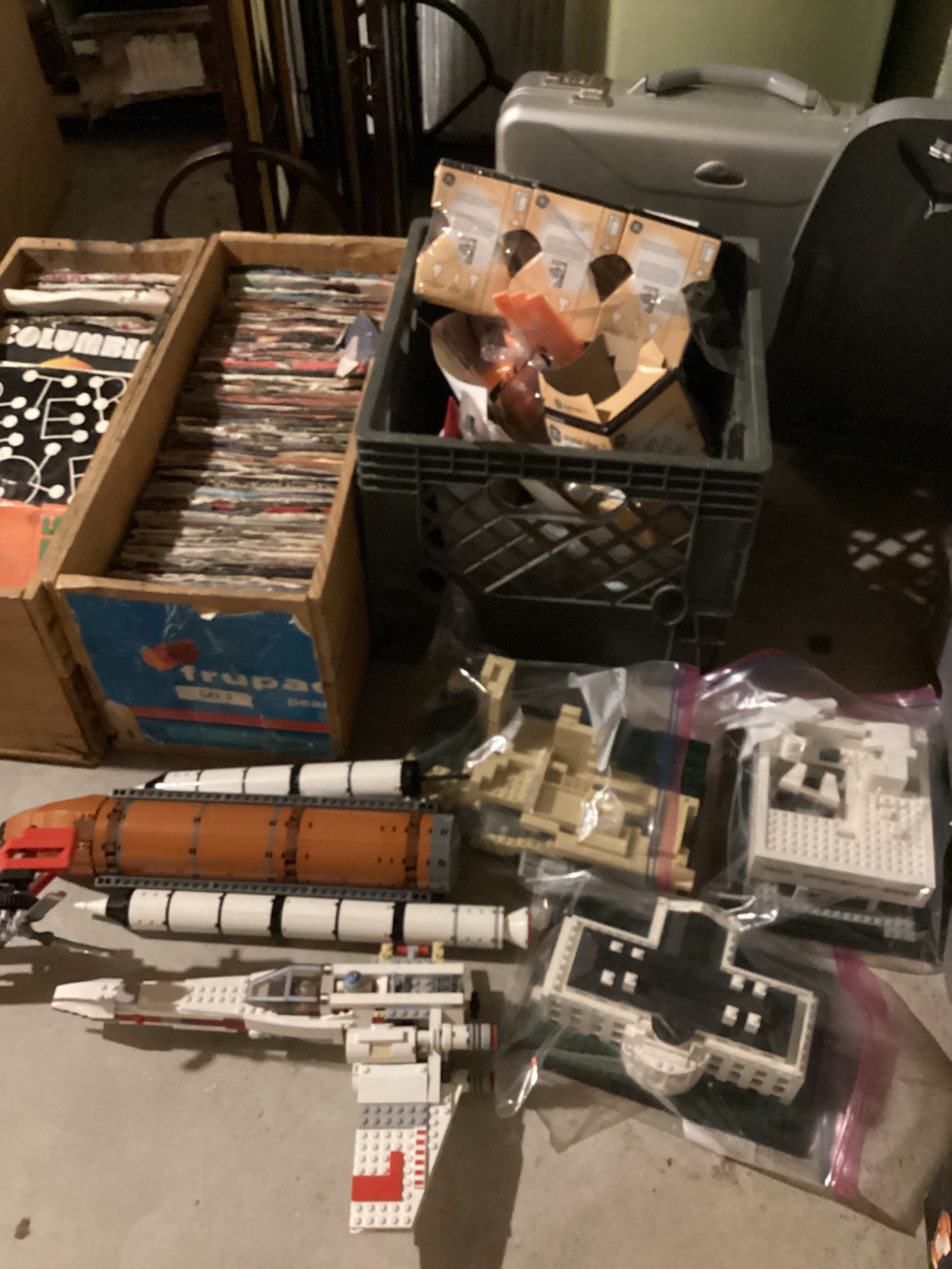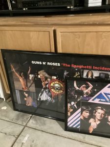 guitars, drum sets, amps, speakers, leather sectional, records, train set, Legos