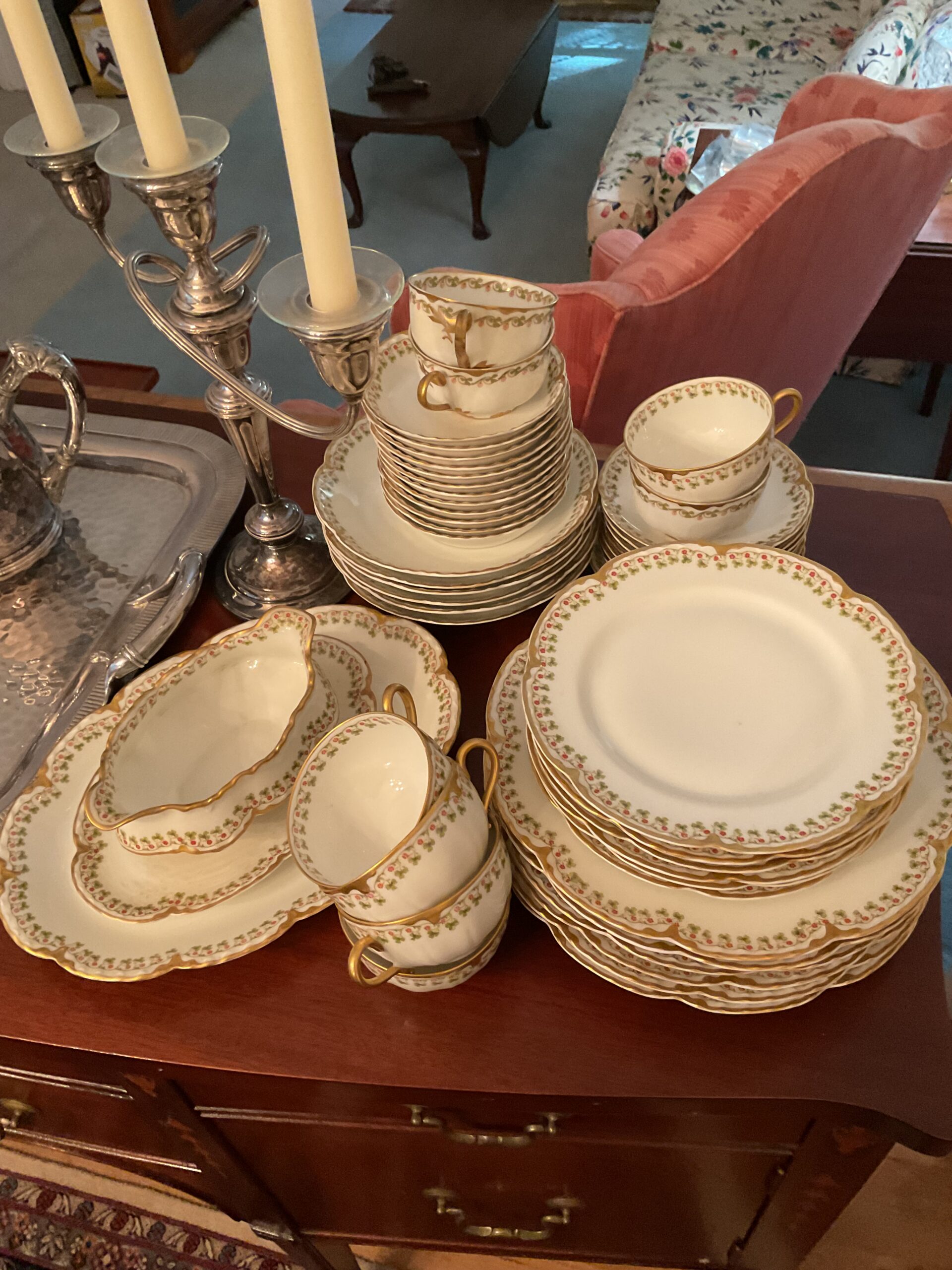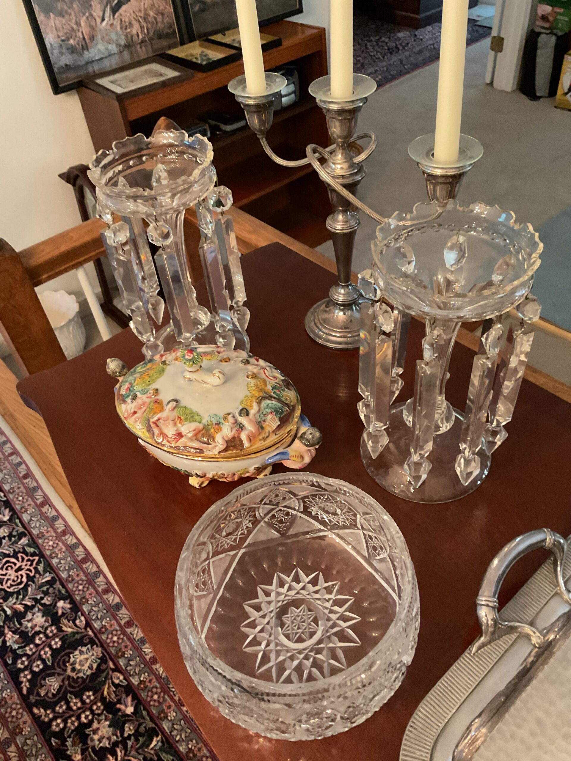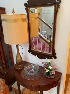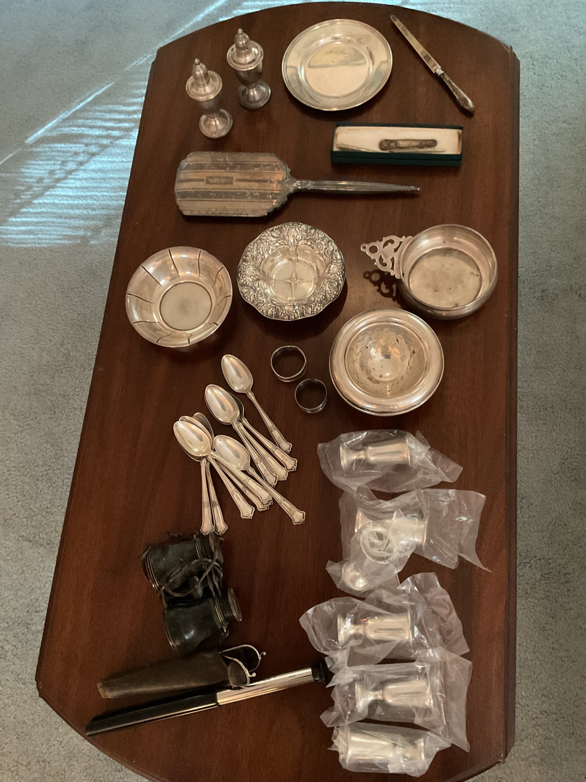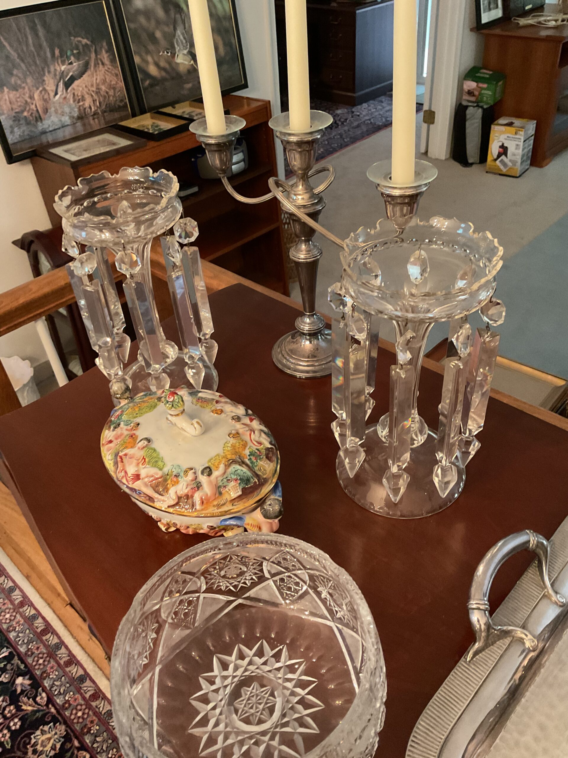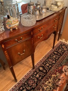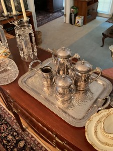 This is a good solid sale with a lot of quality stuff! Antique silver, Sterling, china, crystal, Sheraton style sideboard, Walnut inlaid silver chest on legs, vintage stained glass hanging chandelier, Madame Alexander dolls, vintage wedding dress, 1950s mid century modern dresser, 18 century Chester drawers, mirrors, artwork, vintage Christmas items, lamps, quality upholstered furniture, yard items, and much much more!