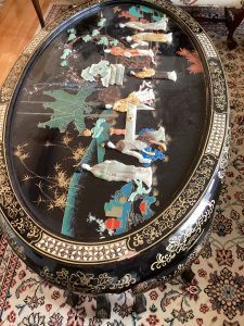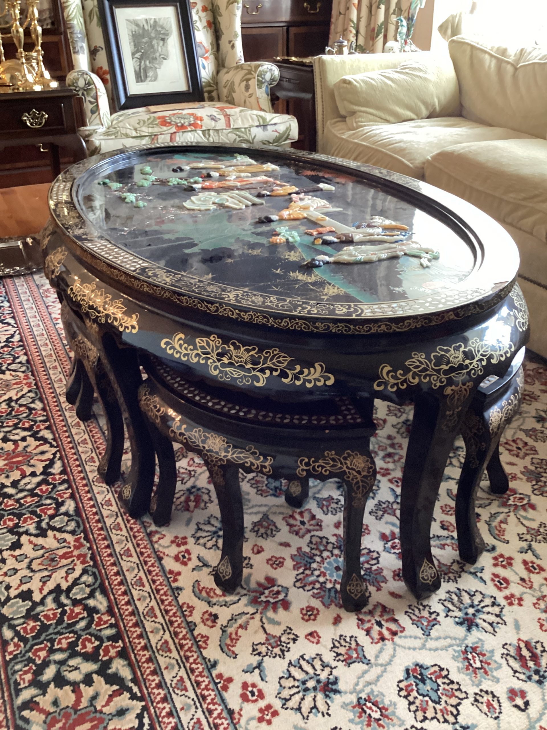 Asian black laquer coffee table with inlaid stone and chairs