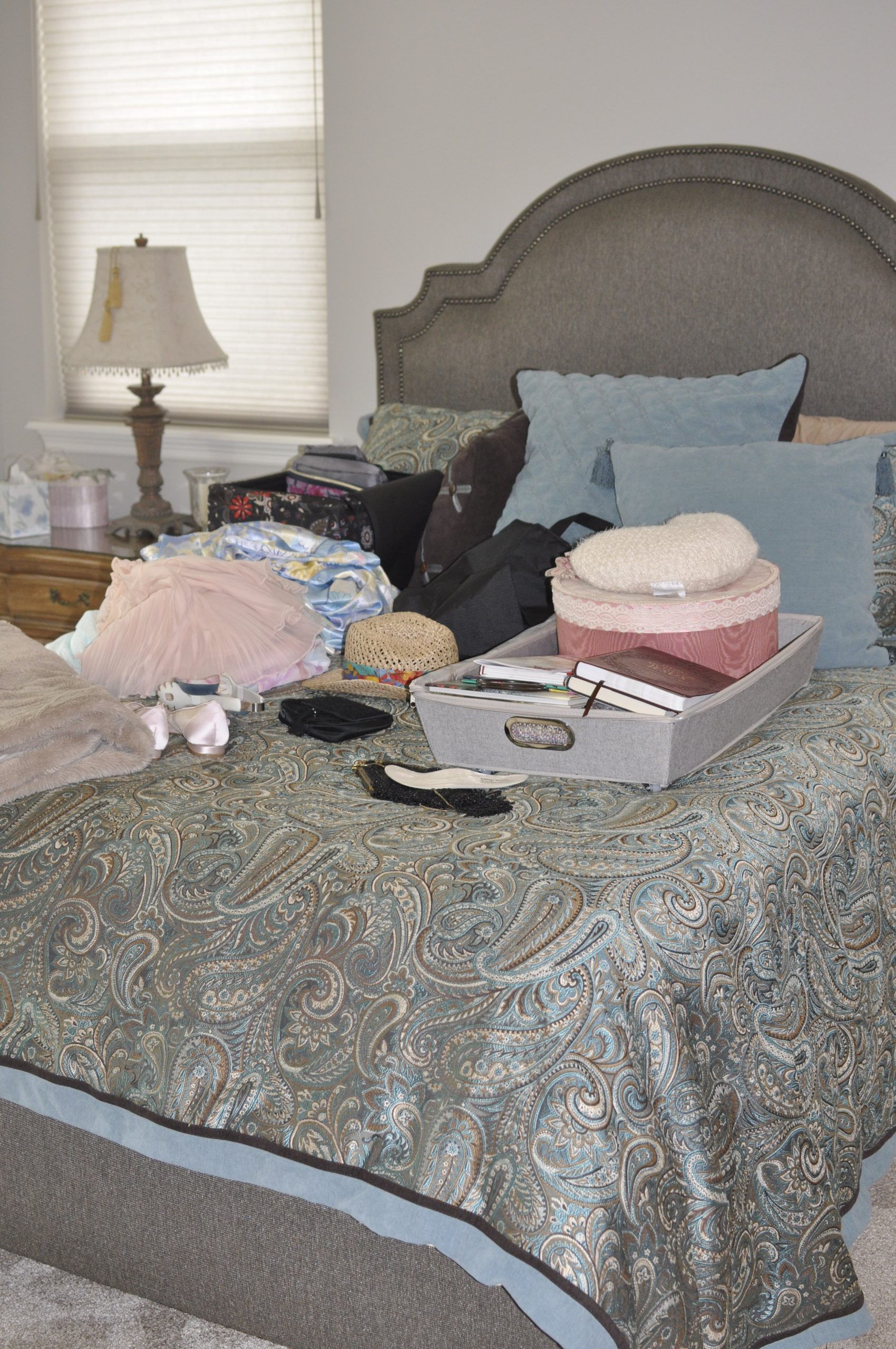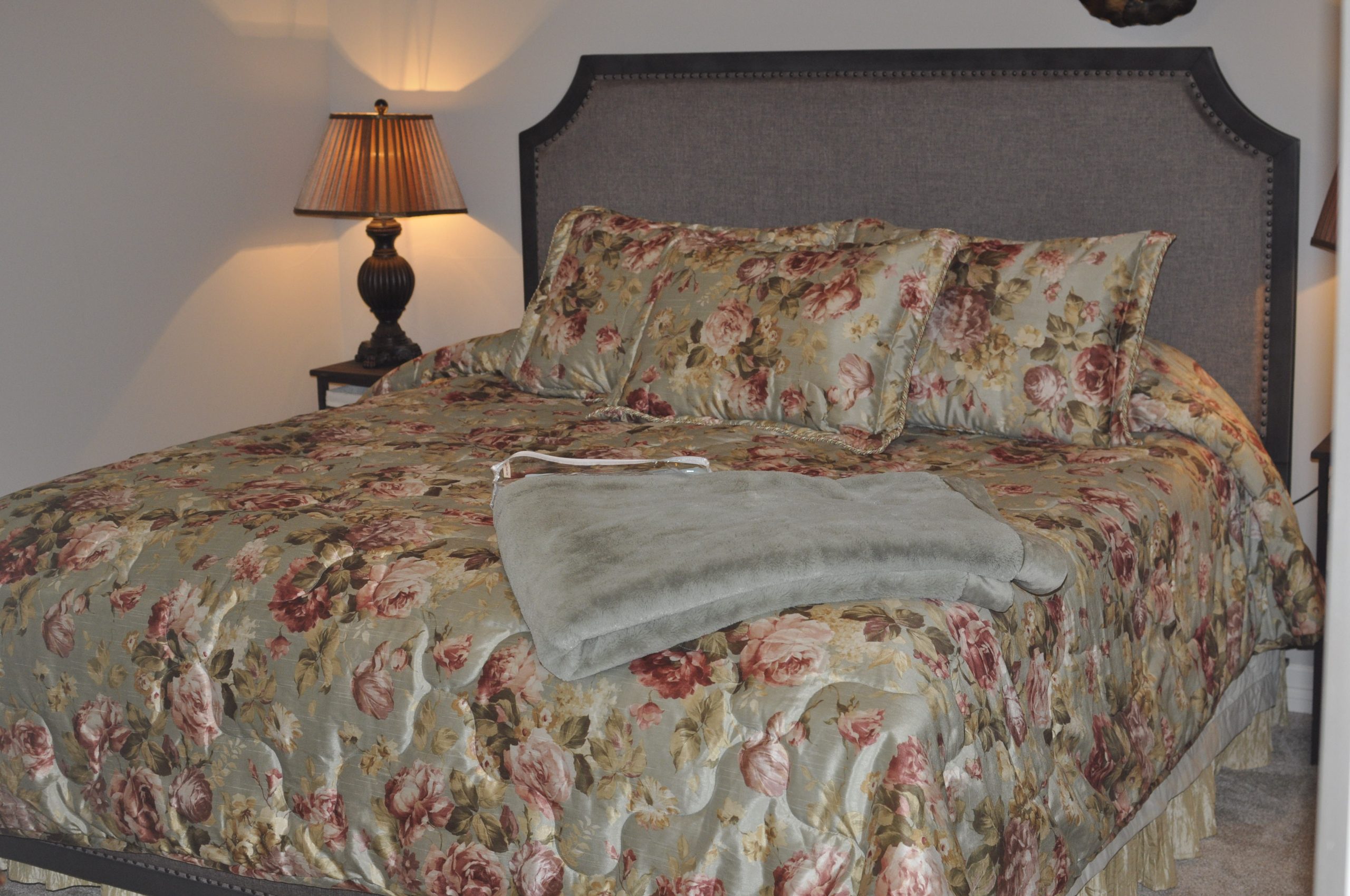 Queen sized bed with upholstered headboard