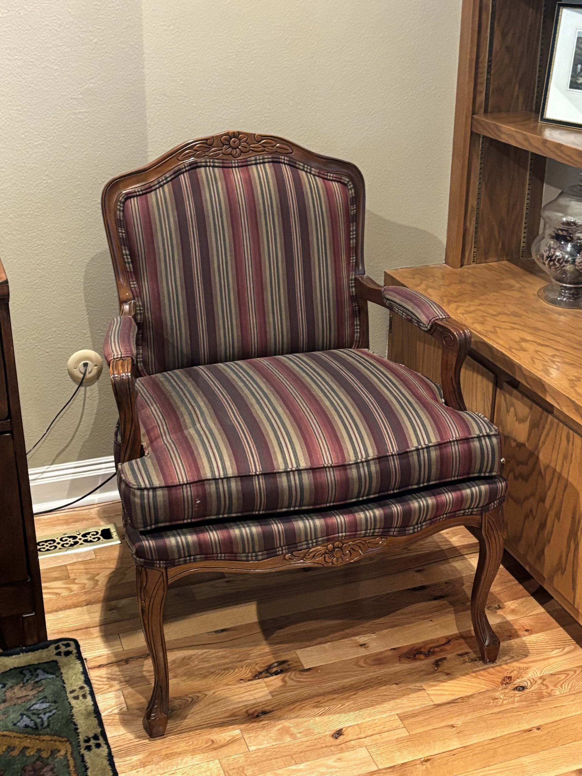 2 French Louis XV Walnut Fauteuil Library Arm Chair with Striped upholstery