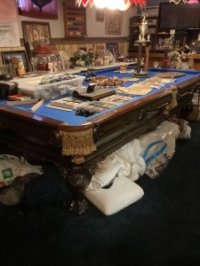vintage pool table with blue felt