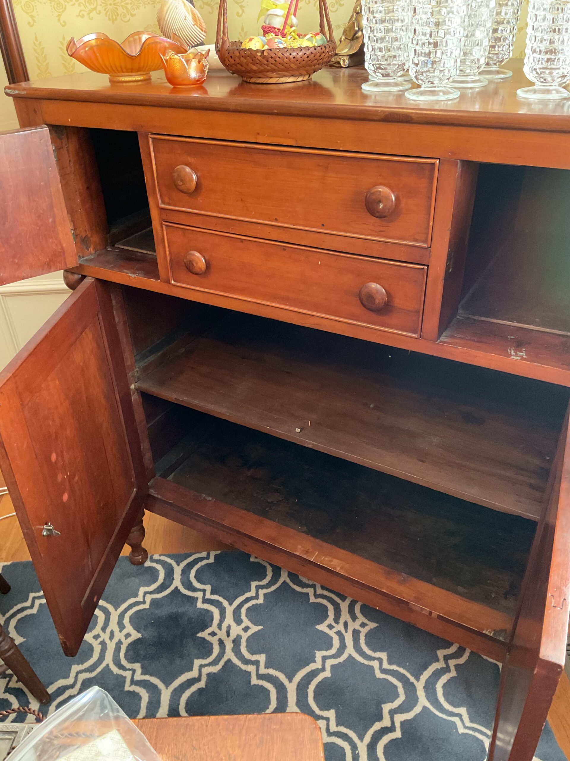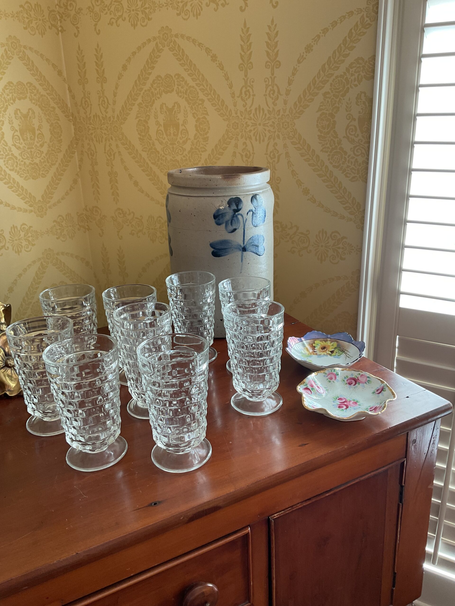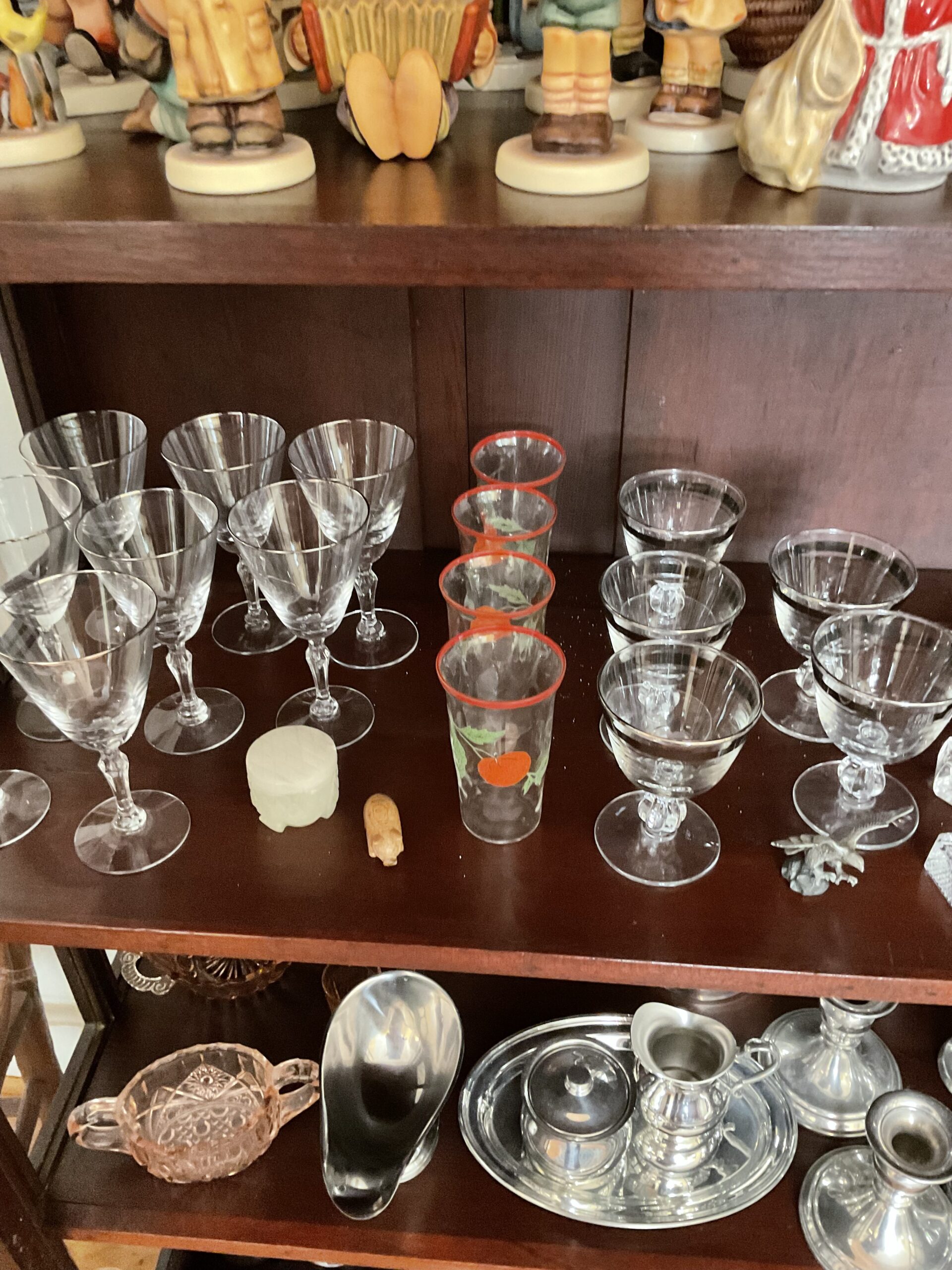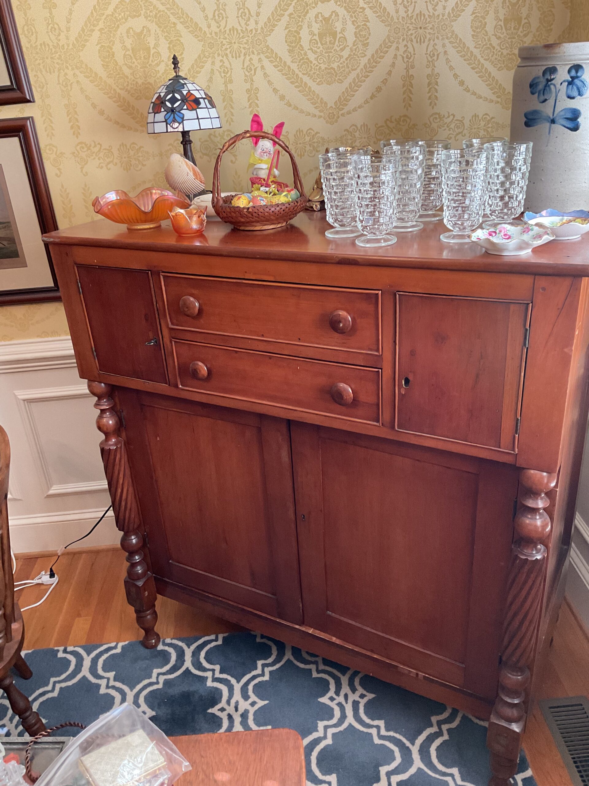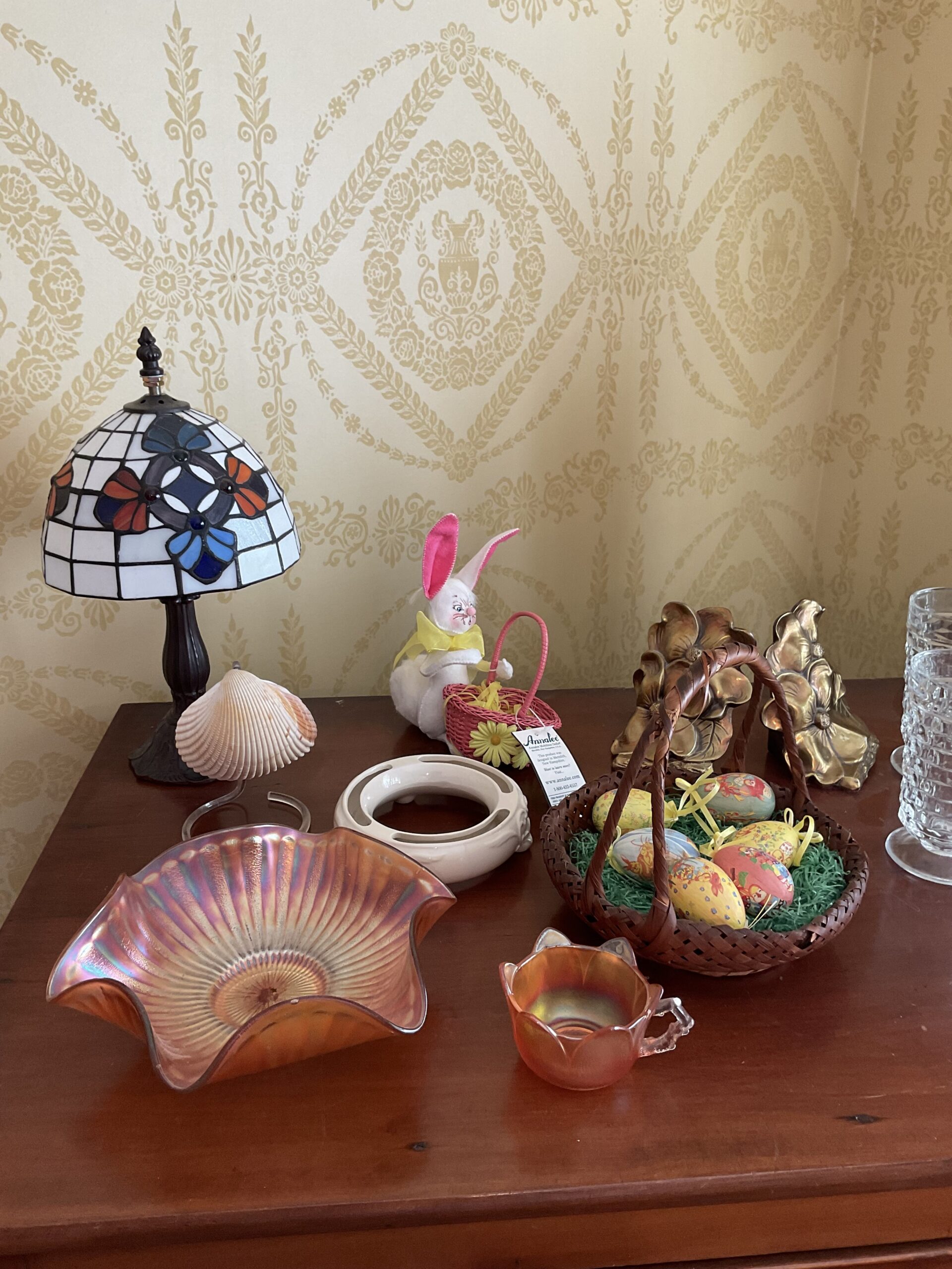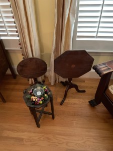 Anitque Pine corner cabinet, southern hunt board, Arts and Crafts style glass front China closet, golden oak press back chairs, golden Oak dining table, Fostoria American glass, Hummel figurines, Royal Dalton China, Crystal, Marble top Victorian tables, Cabinet style photograph,78 rpm records, Oil lamps, Barrister style bookcase, mahogany end tables, Virginia local vintage cookbook collection, Longaberger basket collection, vintage kitchen ware, vintage Corningware including “Spice of Life” pattern and “ Cornflower Blue “, Hinkel Harris nightstands, antique brass bed, Golden Oak washstand, antique oak rocking chairs, Sheraton style gooseneck reproduction sofa, Foxhunt themed decor and prints, oil paintings, framed Victorian prints, Vintage Singer sewing machine, antique school desk, the babies and other small stuffed animals, mahogany chests of drawers, marble top. Victorian washstand, holiday decor items, Craftsman Style entertainment center, vintage crocheted coverlets, ladies clothing size 16 petite to extra large, handbags, scarves and accessories, Antique tools, vintage workbench, garage items, c.1900 Golden Oak recliner, Queen Ann style mahogany server, occasional tables, costume jewelry, antique perfume bottles, straight razor collection, pocket watches, And much much more!